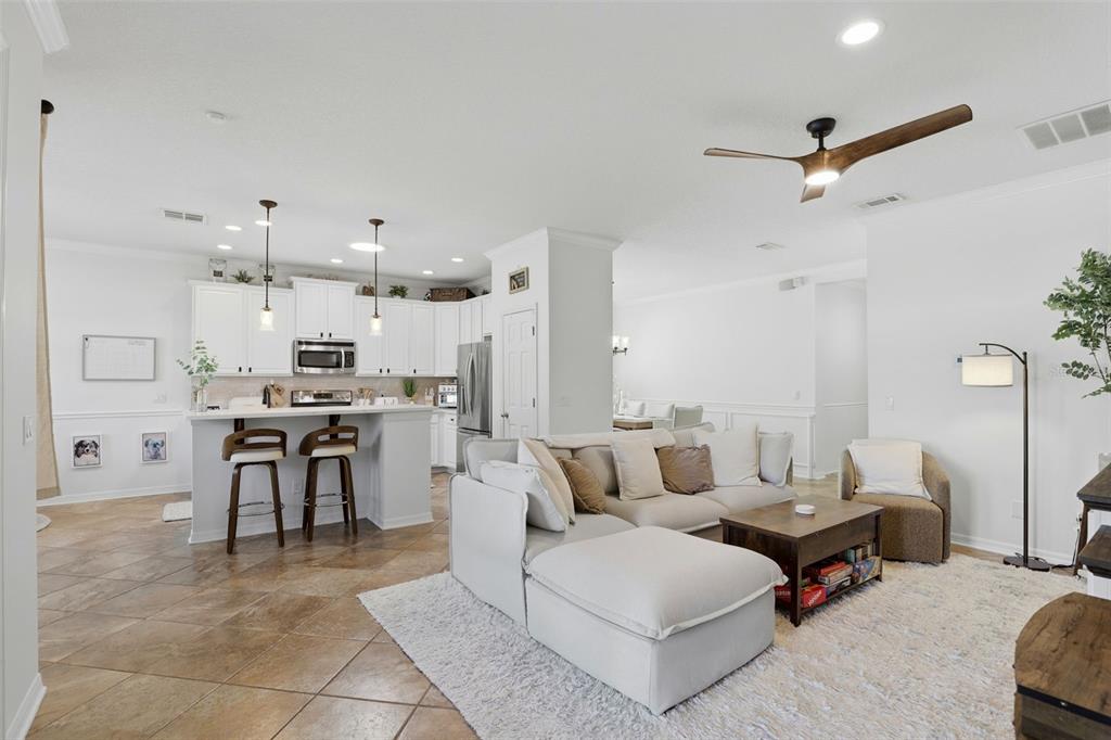 Attic Fan, Built-in Features, Ceiling Fan(s), Crown Molding, Eating Space In Kitchen, High Ceilings, Kitchen/Family Room Combo, Primary Bedroom Main Floor, Skylight(s), Stone Counters, Thermostat, Walk-In Closet(s), Window Treatments