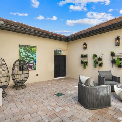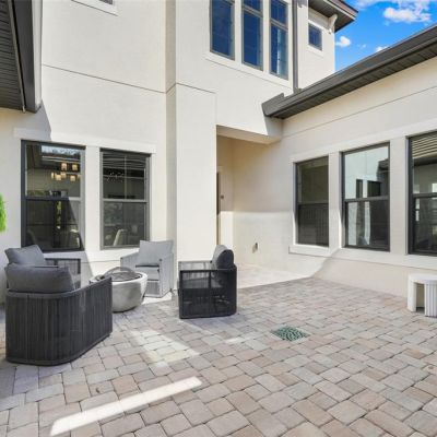 Courtyard, Fire Pit, Irrigation System, Outdoor Grill, Outdoor Kitchen, Shade Shutter(s), Sidewalk, Sliding Doors