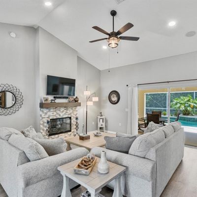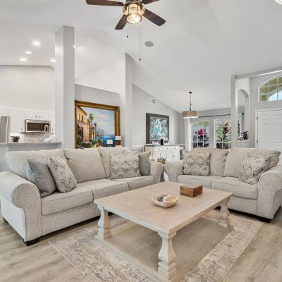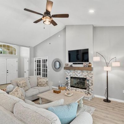 Ceiling Fan(s), Eating Space In Kitchen, High Ceilings, Kitchen/Family Room Combo, Open Floorplan, Primary Bedroom Main Floor, Solid Surface Counters, Split Bedroom, Thermostat, Vaulted Ceiling(s), Walk-In Closet(s), Window Treatments