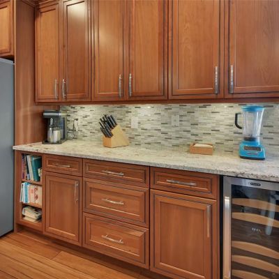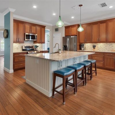 Built-in Features, Ceiling Fan(s), Crown Molding, High Ceilings, Kitchen/Family Room Combo, Living Room/Dining Room Combo, Open Floorplan, Primary Bedroom Main Floor, Solid Surface Counters, Solid Wood Cabinets, Split Bedroom, Stone Counters, Thermostat, Tray Ceiling(s), Walk-In Closet(s)