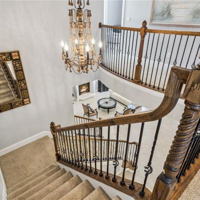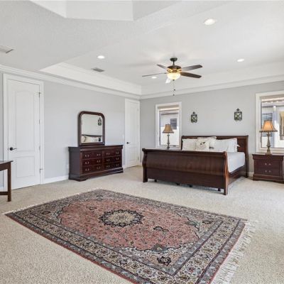 Ceiling Fan(s), Crown Molding, High Ceilings, PrimaryBedroom Upstairs, Solid Surface Counters, Solid Wood Cabinets, Split Bedroom, Stone Counters, Thermostat, Tray Ceiling(s), Walk-In Closet(s)