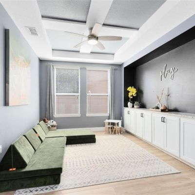 Ceiling Fan(s), Coffered Ceiling(s), Eating Space In Kitchen, Kitchen/Family Room Combo, Open Floorplan, Primary Bedroom Main Floor, Split Bedroom, Stone Counters, Thermostat, Walk-In Closet(s), Window Treatments