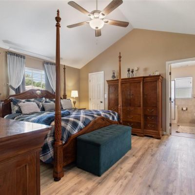 Ceiling Fan(s), Crown Molding, Open Floorplan, Solid Wood Cabinets, Split Bedroom, Thermostat, Vaulted Ceiling(s), Walk-In Closet(s)