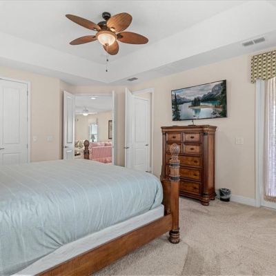 Ceiling Fan(s), Crown Molding, Living Room/Dining Room Combo, Open Floorplan, Primary Bedroom Main Floor, PrimaryBedroom Upstairs, Solid Surface Counters, Solid Wood Cabinets, Split Bedroom, Stone Counters, Thermostat, Tray Ceiling(s), Walk-In Closet(s), Window Treatments