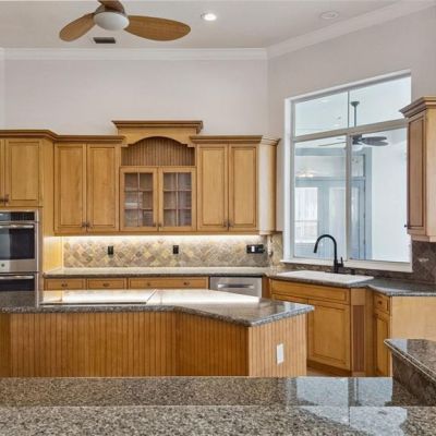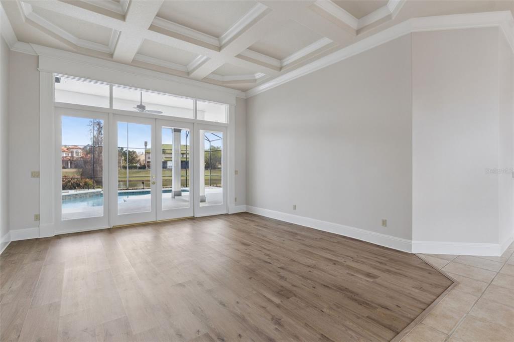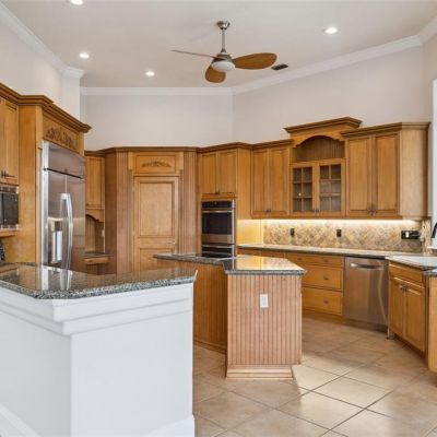 Built-in Features, Ceiling Fan(s), Coffered Ceiling(s), Crown Molding, High Ceilings, Open Floorplan, Primary Bedroom Main Floor, Solid Surface Counters, Solid Wood Cabinets, Split Bedroom, Stone Counters, Thermostat, Tray Ceiling(s), Walk-In Closet(s), Window Treatments