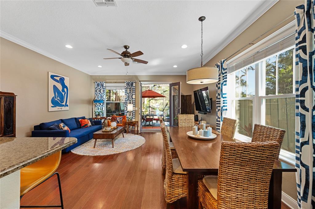 Ceiling Fan(s), Crown Molding, Eating Space In Kitchen, High Ceilings, Living Room/Dining Room Combo, Open Floorplan, PrimaryBedroom Upstairs, Solid Surface Counters, Solid Wood Cabinets, Split Bedroom, Stone Counters, Thermostat, Walk-In Closet(s), Window Treatments