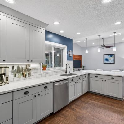 Ceiling Fan(s), Eating Space In Kitchen, High Ceilings, Kitchen/Family Room Combo, Open Floorplan, Primary Bedroom Main Floor, Skylight(s), Solid Surface Counters, Solid Wood Cabinets, Split Bedroom, Thermostat, Vaulted Ceiling(s), Walk-In Closet(s)