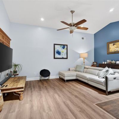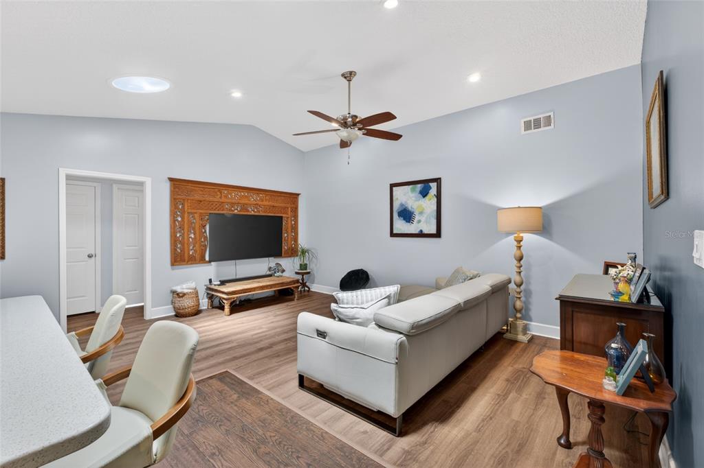 Ceiling Fan(s), Eating Space In Kitchen, High Ceilings, Kitchen/Family Room Combo, Open Floorplan, Primary Bedroom Main Floor, Skylight(s), Solid Surface Counters, Solid Wood Cabinets, Split Bedroom, Thermostat, Vaulted Ceiling(s), Walk-In Closet(s)
