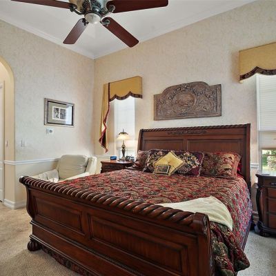 Ceiling Fan(s), Crown Molding, Eating Space In Kitchen, High Ceilings, Living Room/Dining Room Combo, Primary Bedroom Main Floor, Solid Surface Counters, Split Bedroom, Stone Counters, Tray Ceiling(s), Vaulted Ceiling(s), Walk-In Closet(s), Window Treatments