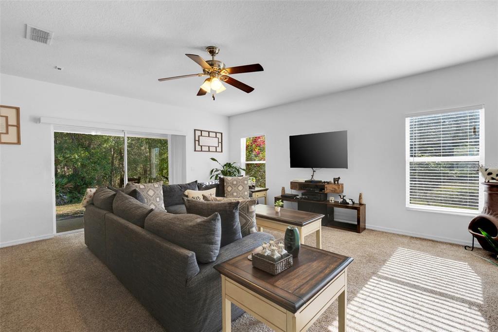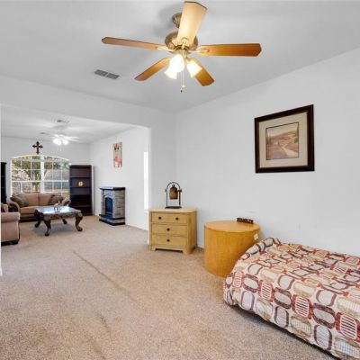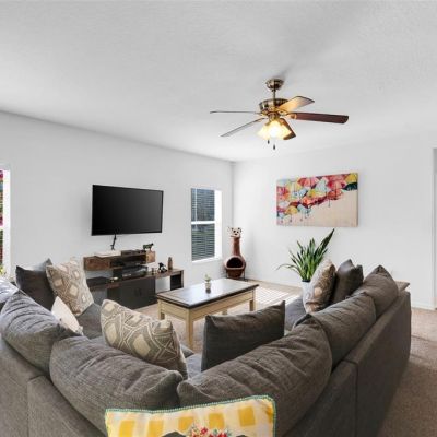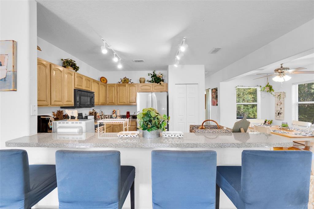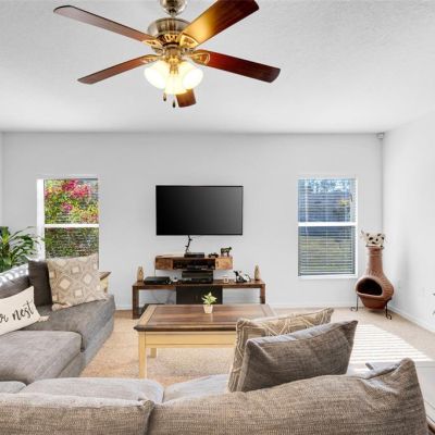 Ceiling Fan(s), Eating Space In Kitchen, Kitchen/Family Room Combo, Open Floorplan, PrimaryBedroom Upstairs, Solid Surface Counters, Thermostat Attic Fan, Walk-In Closet(s), Window Treatments