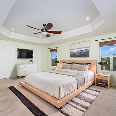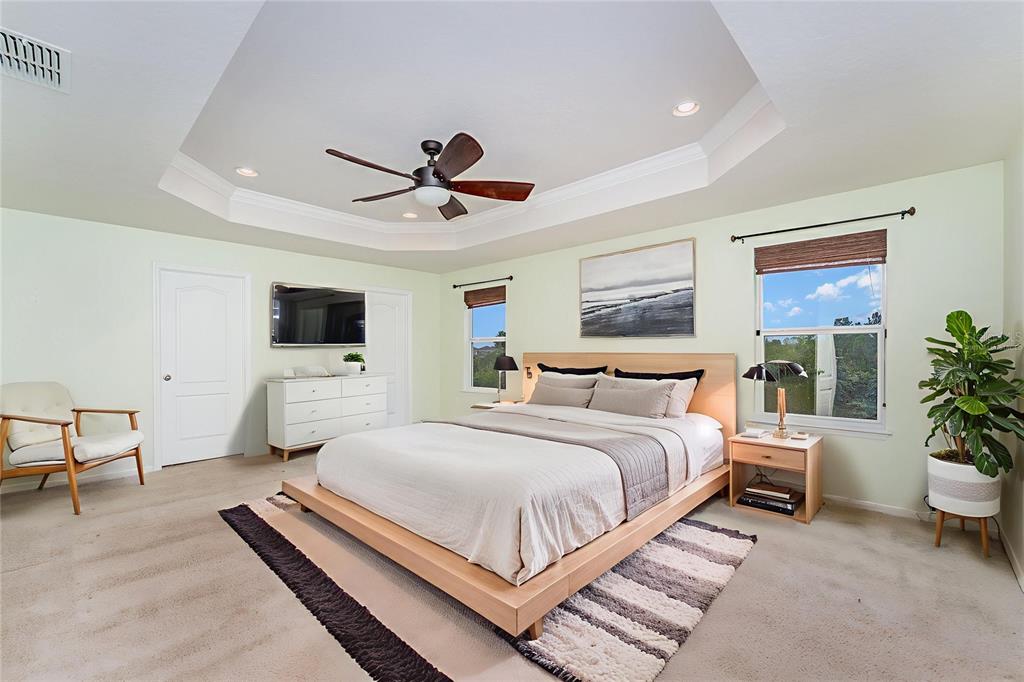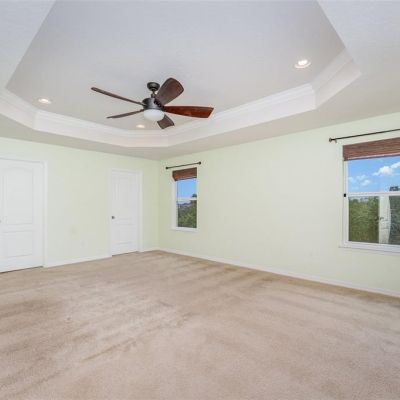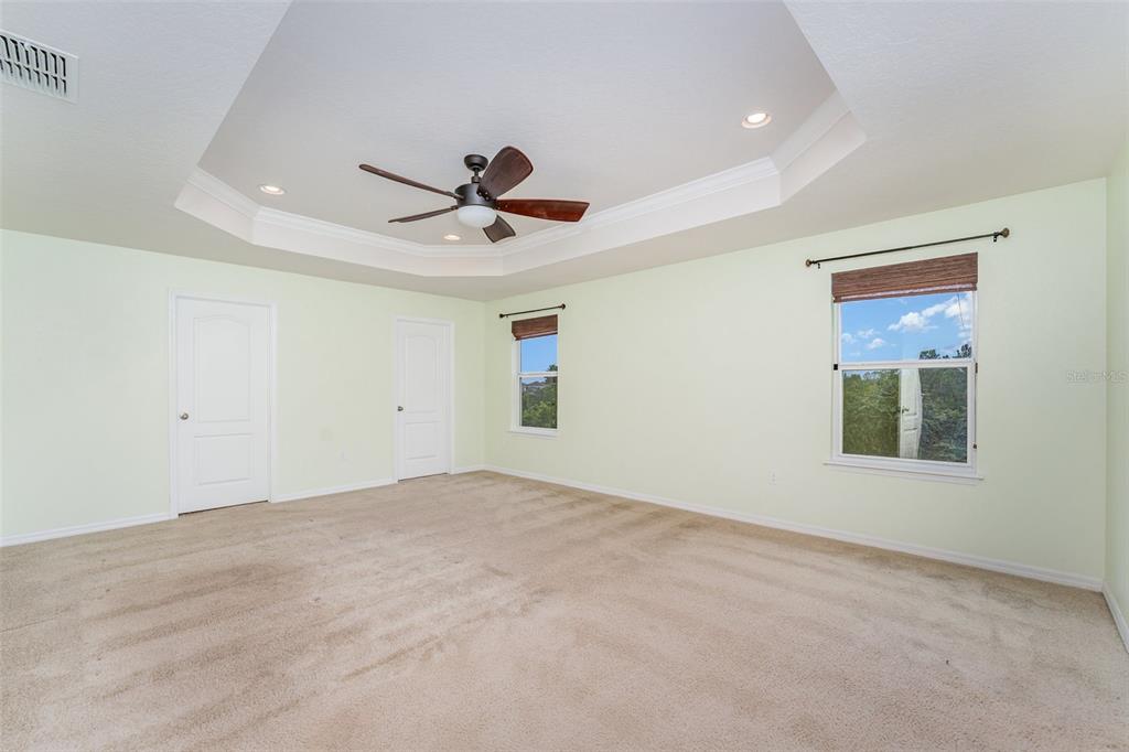 Ceiling Fan(s), Eating Space In Kitchen, High Ceilings, Open Floorplan, PrimaryBedroom Upstairs, Solid Surface Counters, Solid Wood Cabinets, Stone Counters, Thermostat, Tray Ceiling(s), Walk-In Closet(s)
