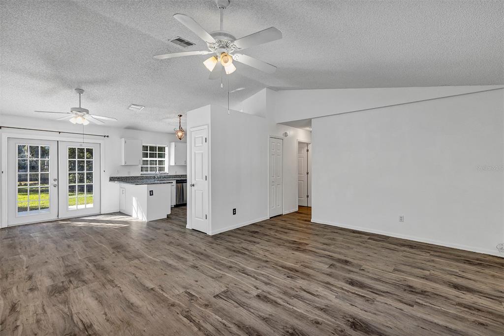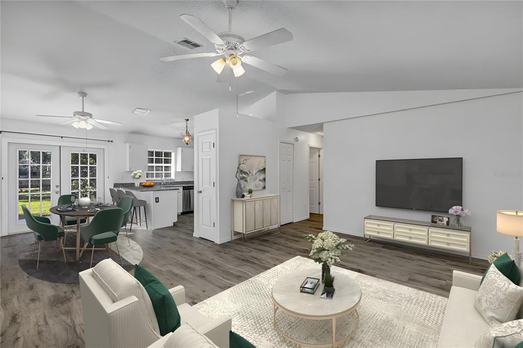 Ceiling Fan(s), Living Room/Dining Room Combo, Open Floorplan, Solid Wood Cabinets, Stone Counters, Thermostat, Vaulted Ceiling(s)