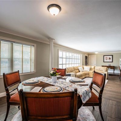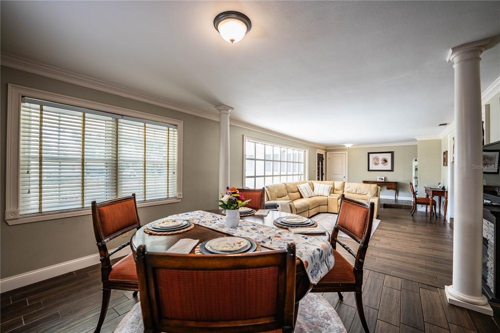 Ceiling Fan(s), High Ceilings, Kitchen/Family Room Combo, L Dining, Living Room/Dining Room Combo, Open Floorplan, Window Treatments