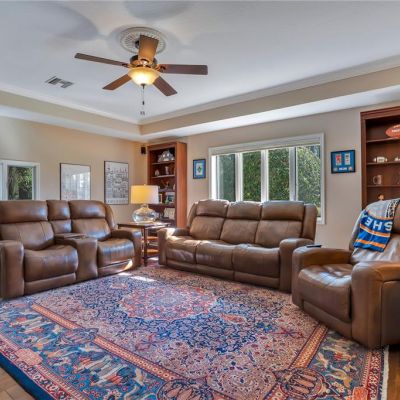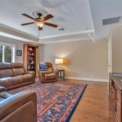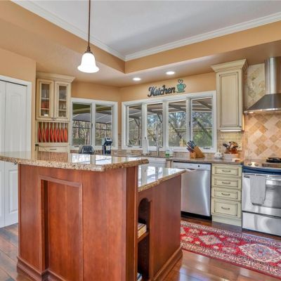 Attic Fan, Attic Ventilator, Ceiling Fan(s), Crown Molding, Eating Space In Kitchen, High Ceilings, Kitchen/Family Room Combo, Primary Bedroom Main Floor, Solid Wood Cabinets, Split Bedroom, Stone Counters, Thermostat, Tray Ceiling(s), Vaulted Ceiling(s), Walk-In Closet(s), Window Treatments