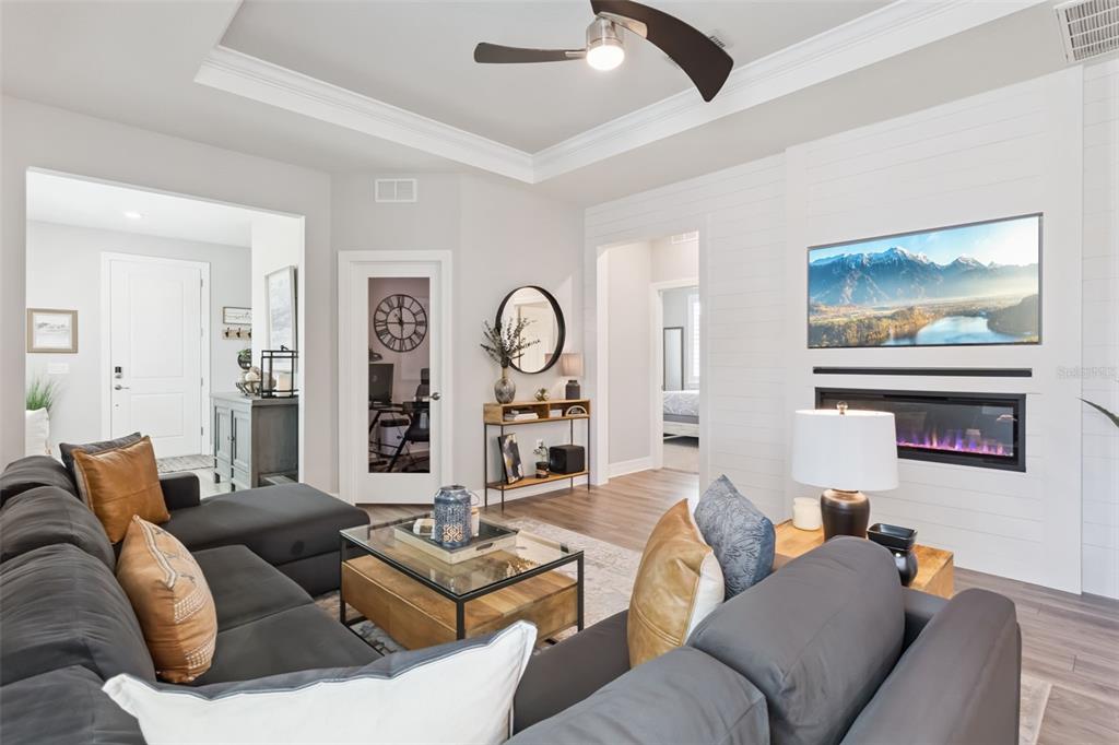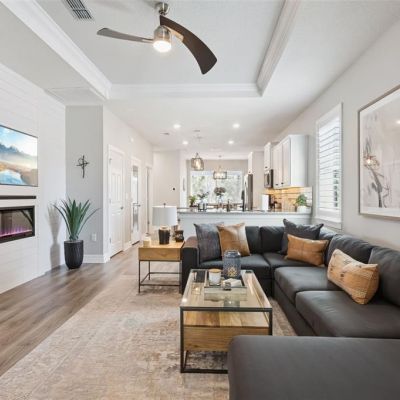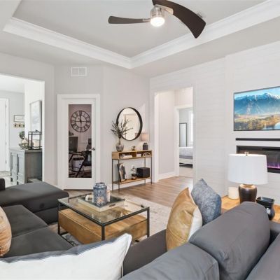 Built-in Features, Ceiling Fan(s), Crown Molding, In Wall Pest System, Open Floorplan, Primary Bedroom Main Floor, Split Bedroom, Stone Counters, Thermostat, Tray Ceiling(s), Walk-In Closet(s), Window Treatments