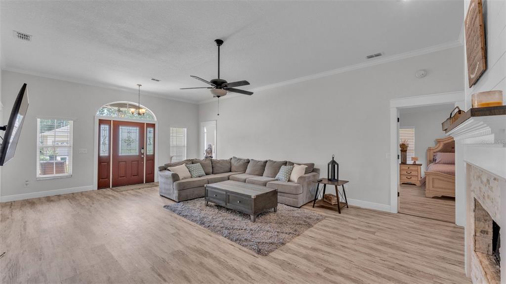 Ceiling Fan(s), Crown Molding, Eating Space In Kitchen, High Ceilings, Open Floorplan, Primary Bedroom Main Floor, Solid Wood Cabinets, Stone Counters, Thermostat, Walk-In Closet(s), Window Treatments