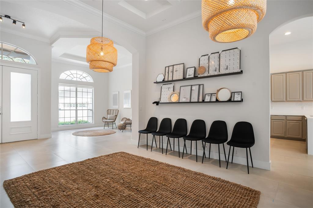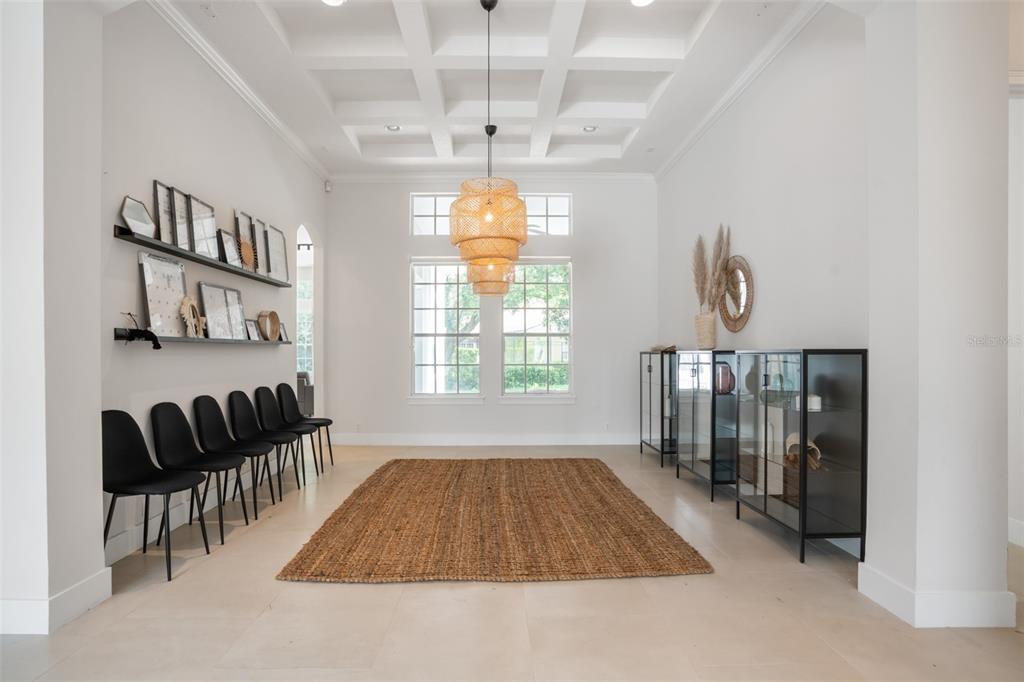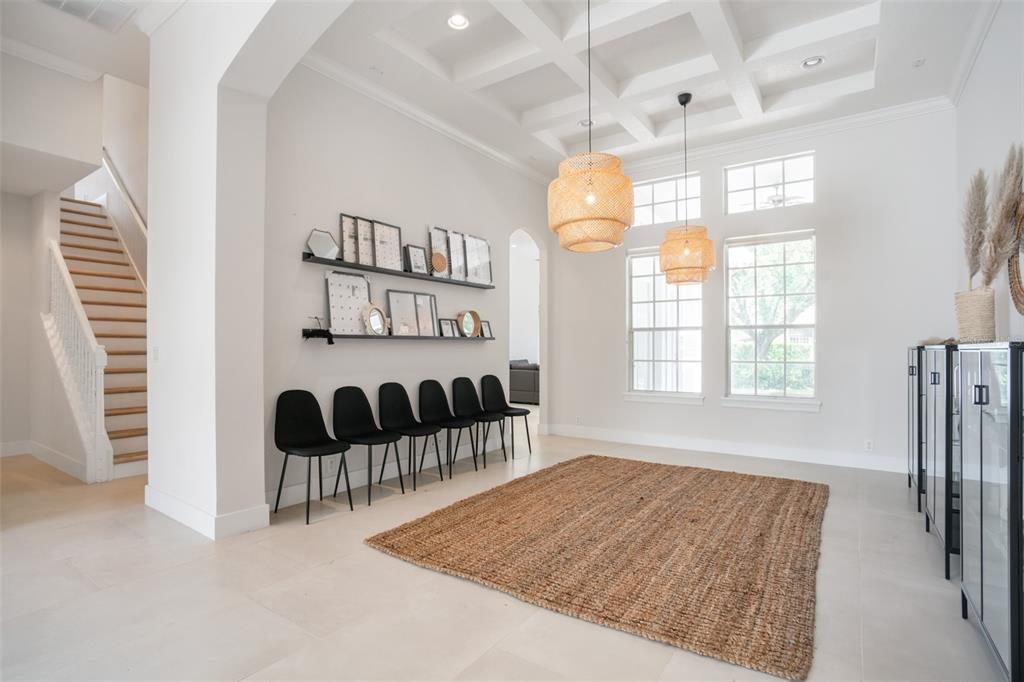 Built-in Features, Coffered Ceiling(s), Crown Molding, Eating Space In Kitchen, High Ceilings, Kitchen/Family Room Combo, Open Floorplan, Primary Bedroom Main Floor, Solid Surface Counters, Solid Wood Cabinets, Split Bedroom, Thermostat, Tray Ceiling(s), Walk-In Closet(s), Window Treatments