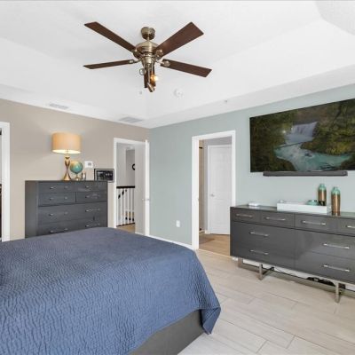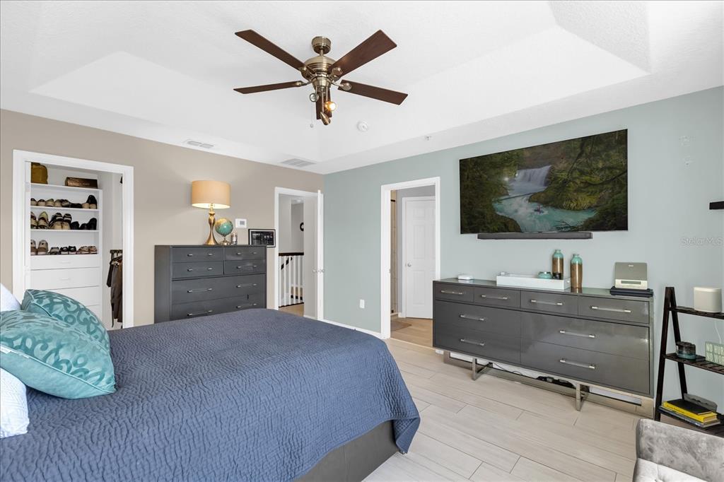 Ceiling Fan(s), Crown Molding, PrimaryBedroom Upstairs, Solid Surface Counters, Tray Ceiling(s), Walk-In Closet(s)