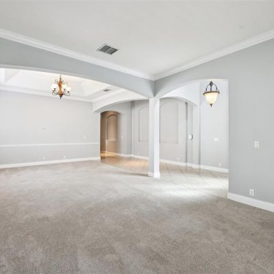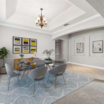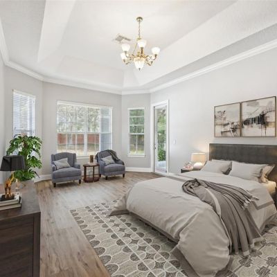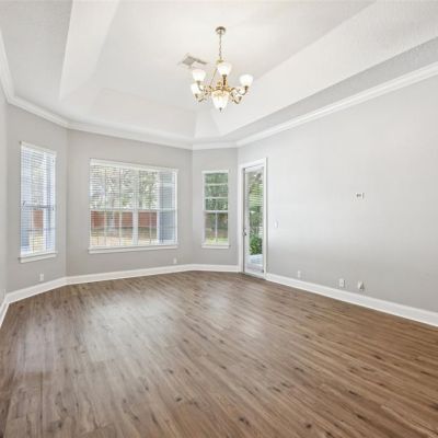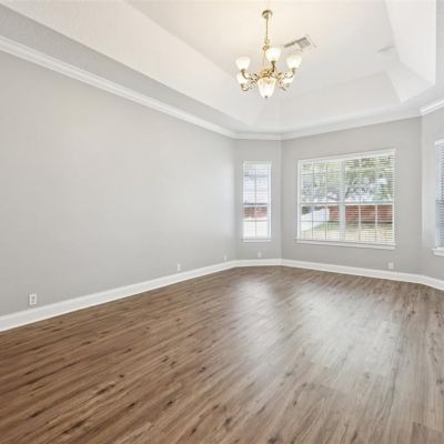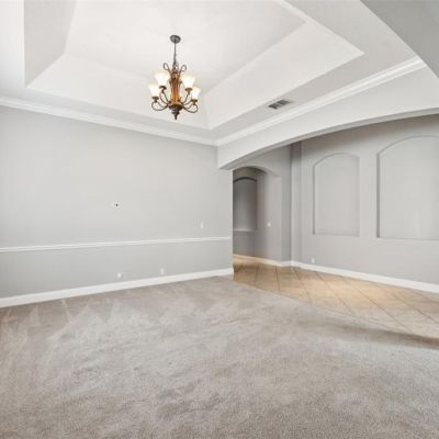 Crown Molding, Eating Space In Kitchen, High Ceilings, Kitchen/Family Room Combo, Living Room/Dining Room Combo, Open Floorplan, Primary Bedroom Main Floor, Stone Counters, Thermostat, Tray Ceiling(s), Walk-In Closet(s)