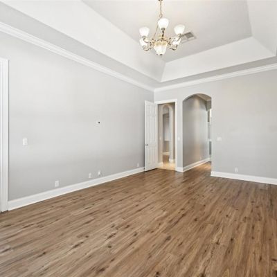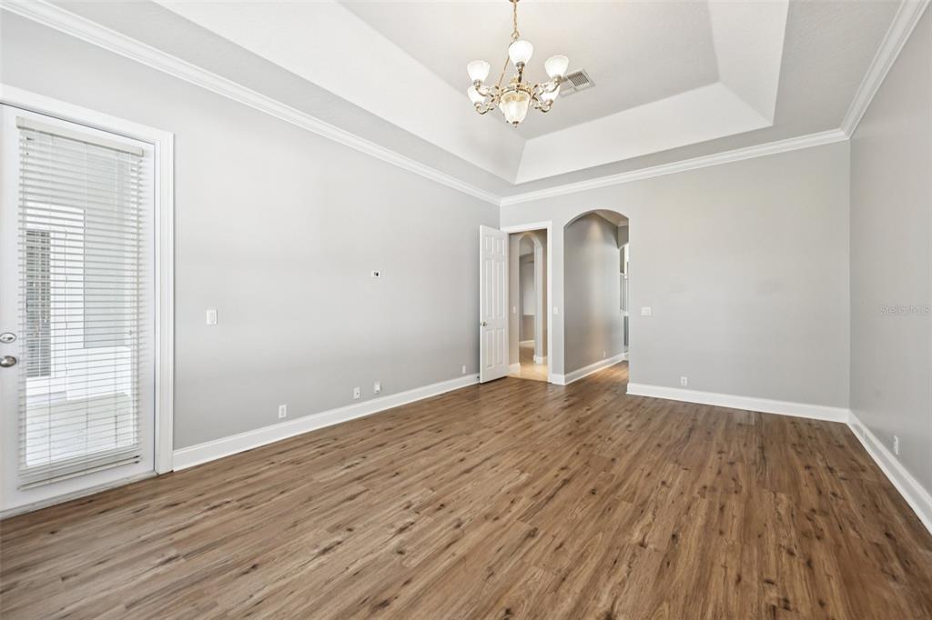 Crown Molding, Eating Space In Kitchen, High Ceilings, Kitchen/Family Room Combo, Living Room/Dining Room Combo, Open Floorplan, Primary Bedroom Main Floor, Stone Counters, Thermostat, Tray Ceiling(s), Walk-In Closet(s)