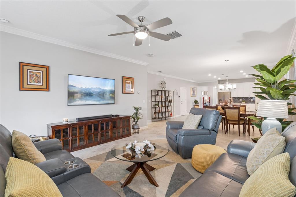 Ceiling Fan(s), Crown Molding, Living Room/Dining Room Combo, Open Floorplan, Primary Bedroom Main Floor, Smart Home, Solid Surface Counters, Split Bedroom, Thermostat, Walk-In Closet(s), Window Treatments