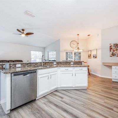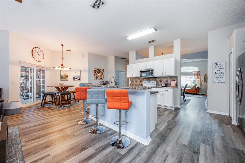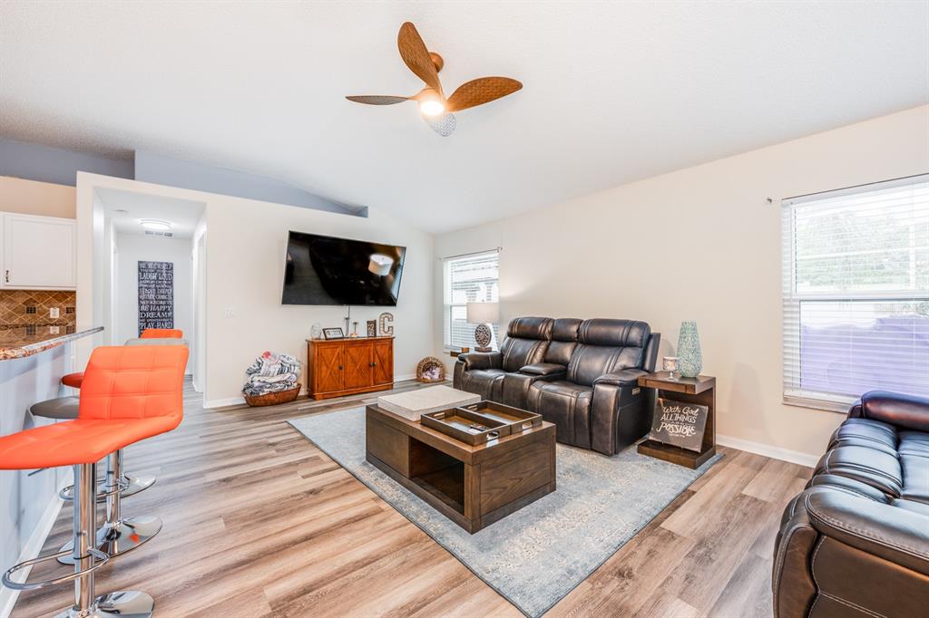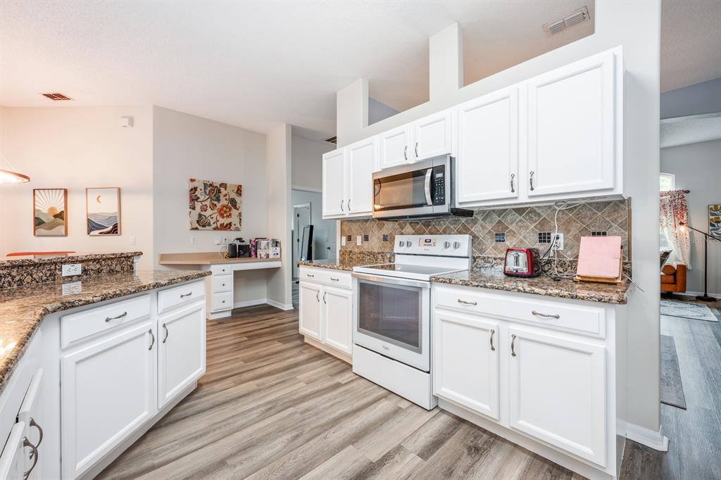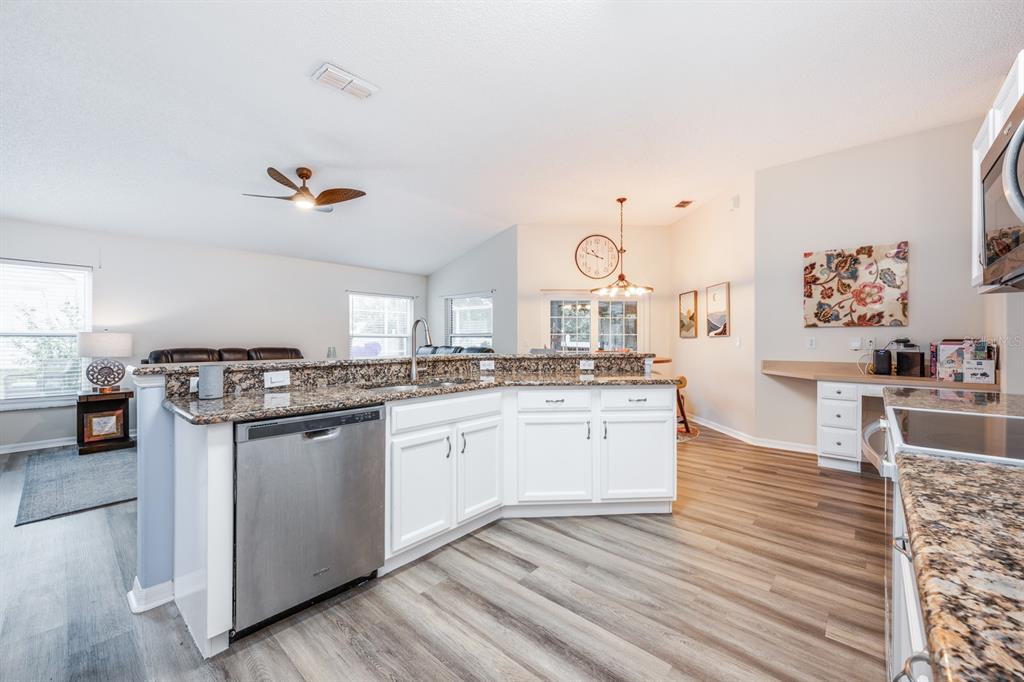 Ceiling Fan(s), Eating Space In Kitchen, Kitchen/Family Room Combo, Living Room/Dining Room Combo, Open Floorplan, Solid Surface Counters, Solid Wood Cabinets, Split Bedroom, Stone Counters, Thermostat, Walk-In Closet(s), Window Treatments