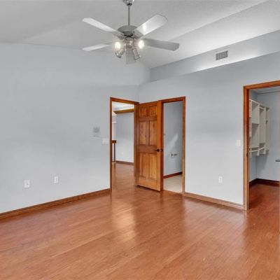 Cathedral Ceiling(s), Ceiling Fan(s), Chair Rail, High Ceilings, Primary Bedroom Main Floor, Solid Surface Counters, Solid Wood Cabinets, Split Bedroom, Stone Counters, Thermostat, Vaulted Ceiling(s), Walk-In Closet(s), Window Treatments