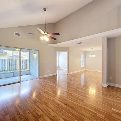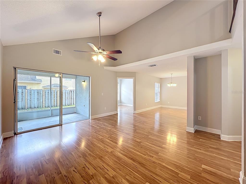Cathedral Ceiling(s), Ceiling Fan(s), Eating Space In Kitchen, High Ceilings, Living Room/Dining Room Combo, Thermostat, Vaulted Ceiling(s)
