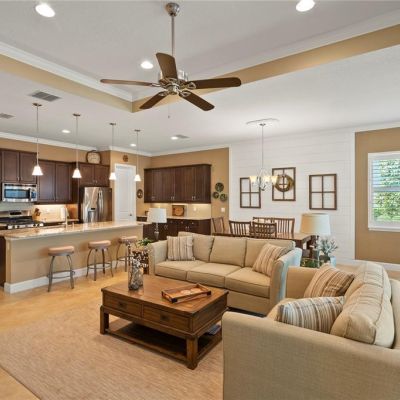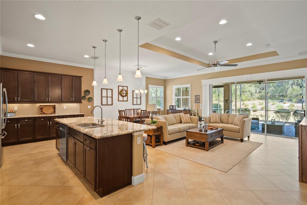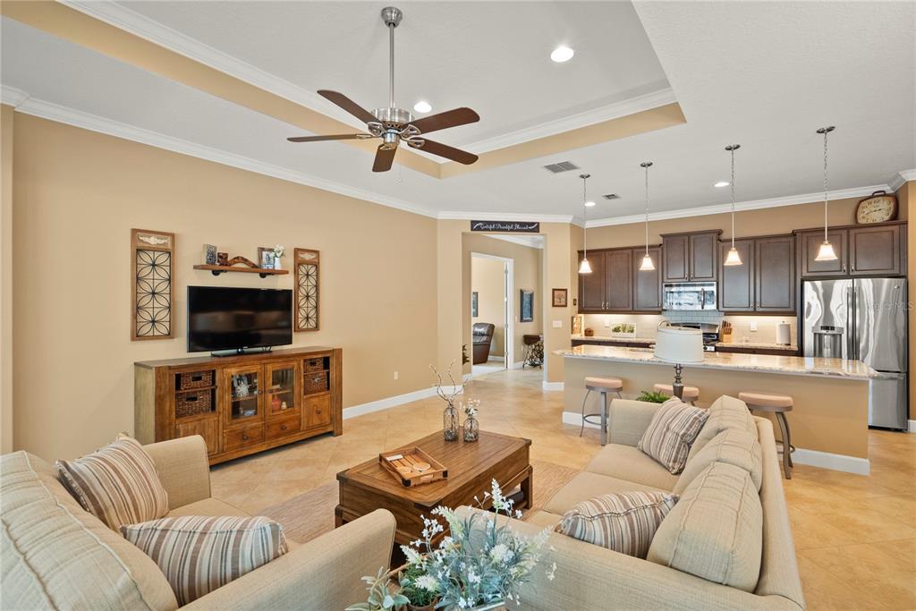 Built-in Features, Ceiling Fan(s), Crown Molding, Eating Space In Kitchen, High Ceilings, Kitchen/Family Room Combo, Open Floorplan, Primary Bedroom Main Floor, Solid Wood Cabinets, Split Bedroom, Stone Counters, Vaulted Ceiling(s), Walk-In Closet(s)