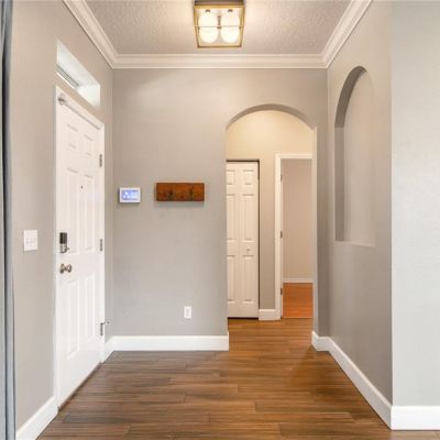 Crown Molding, Eating Space In Kitchen, Kitchen/Family Room Combo, Primary Bedroom Main Floor, Solid Wood Cabinets, Split Bedroom, Stone Counters, Thermostat