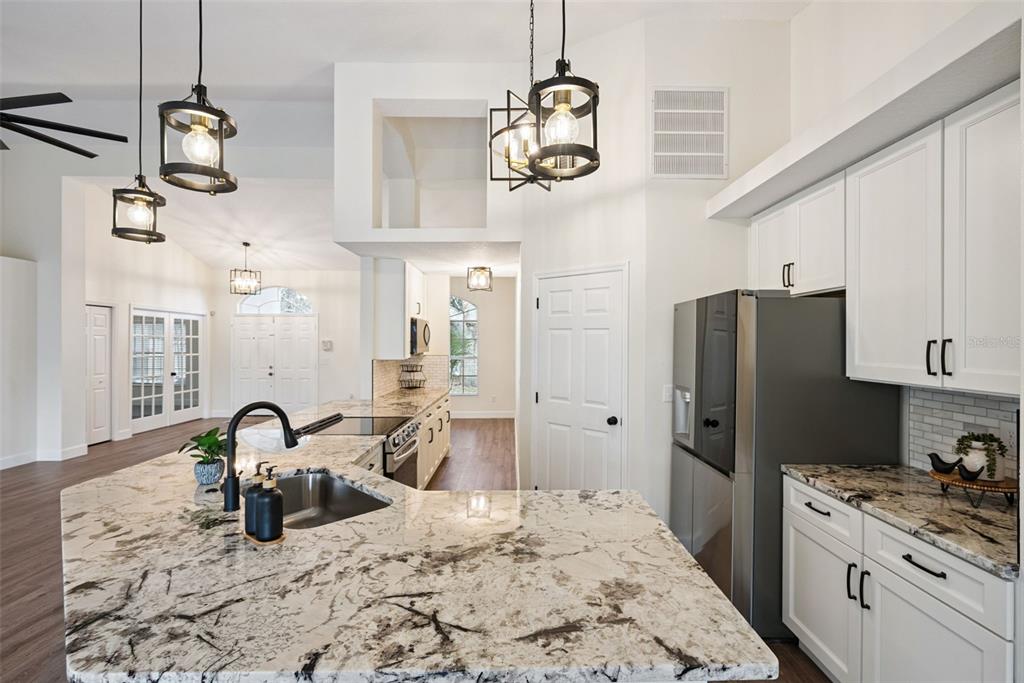 Cathedral Ceiling(s), Ceiling Fan(s), High Ceilings, Open Floorplan, Primary Bedroom Main Floor, Split Bedroom, Stone Counters, Walk-In Closet(s)