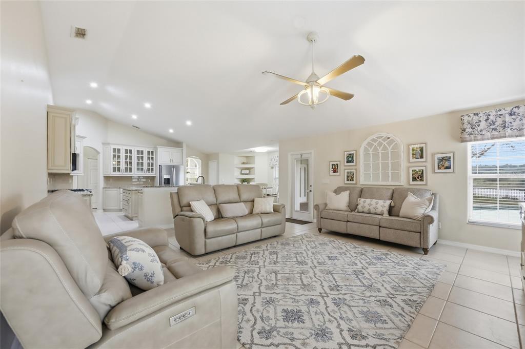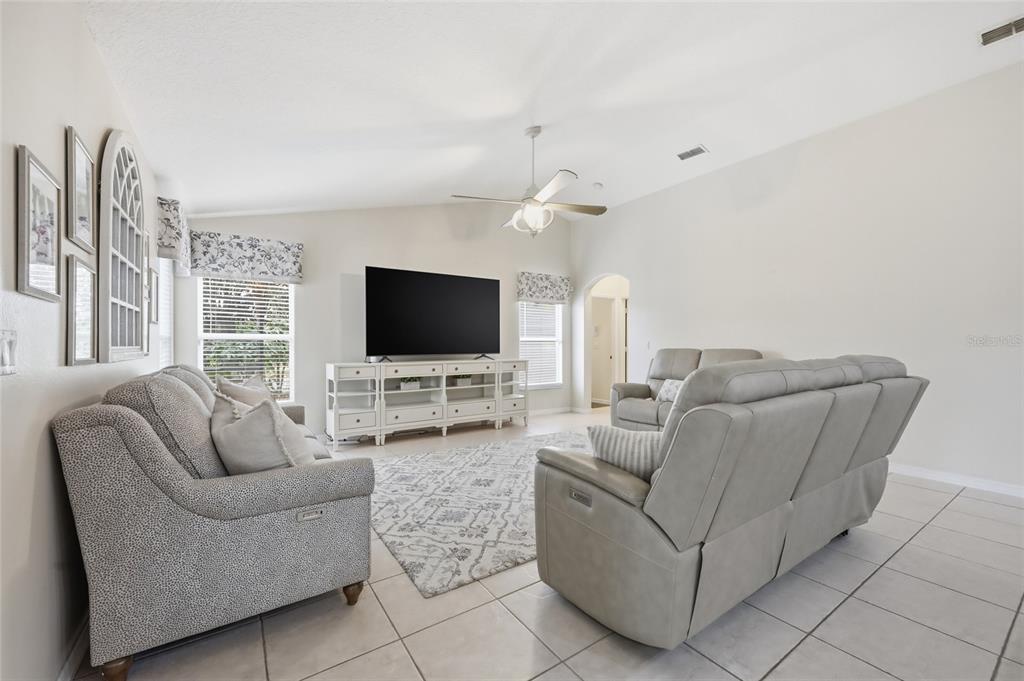 Ceiling Fan(s), Eating Space In Kitchen, Kitchen/Family Room Combo, Primary Bedroom Main Floor, Split Bedroom, Stone Counters, Thermostat, Vaulted Ceiling(s)