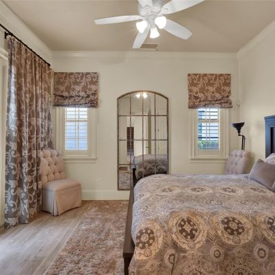 Ceiling Fan(s), Coffered Ceiling(s), Crown Molding, Eating Space In Kitchen, High Ceilings, Open Floorplan, Primary Bedroom Main Floor, Solid Wood Cabinets, Stone Counters, Thermostat, Walk-In Closet(s), Window Treatments