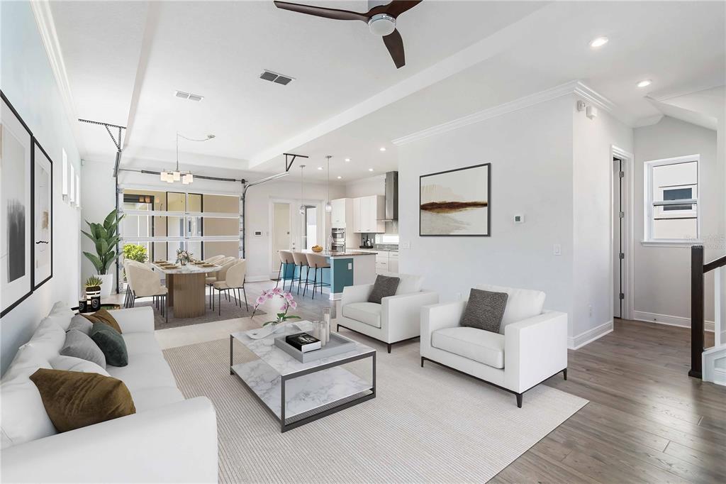 Ceiling Fan(s), Crown Molding, High Ceilings, Kitchen/Family Room Combo, Living Room/Dining Room Combo, Open Floorplan, PrimaryBedroom Upstairs, Split Bedroom, Stone Counters, Thermostat, Tray Ceiling(s)