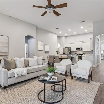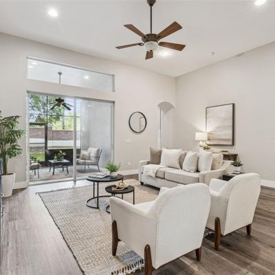 Kitchen/Family Room Combo, Window Treatments, Ceiling Fan(s), Eating Space In Kitchen, High Ceilings, Living Room/Dining Room Combo, Primary Bedroom Main Floor, Open Floorplan, Solid Surface Counters, Thermostat, Walk-In Closet(s)