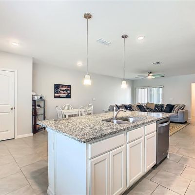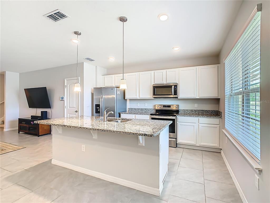 Ceiling Fan(s), High Ceilings, Kitchen/Family Room Combo, Open Floorplan, PrimaryBedroom Upstairs, Solid Surface Counters, Solid Wood Cabinets, Stone Counters, Thermostat, Walk-In Closet(s)