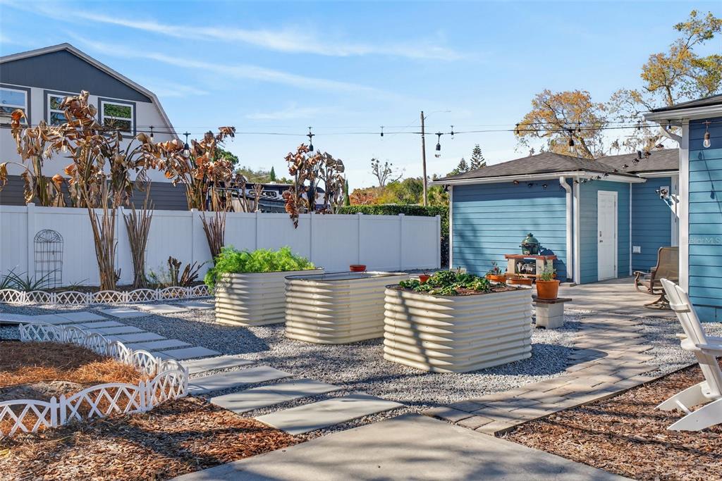Garden, Irrigation System, Lighting, Private Entrance, Private Mailbox, Private Yard, Rain Barrel/Cistern(s), Rain Gutters, Sidewalk, Sprinkler Metered, Storage