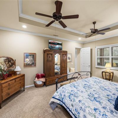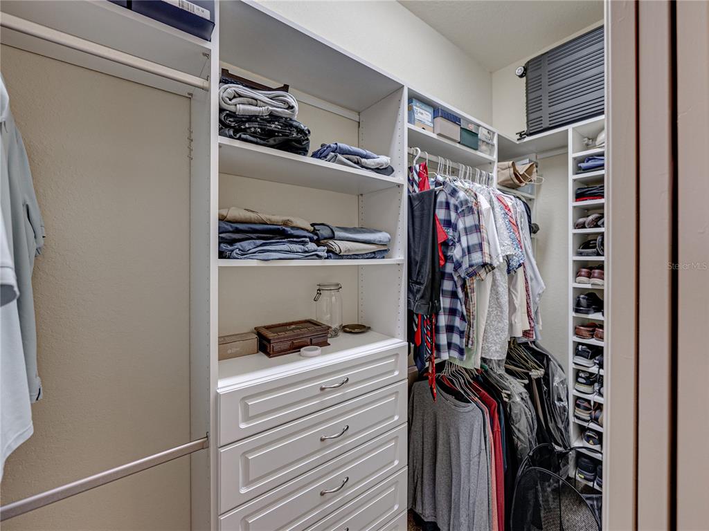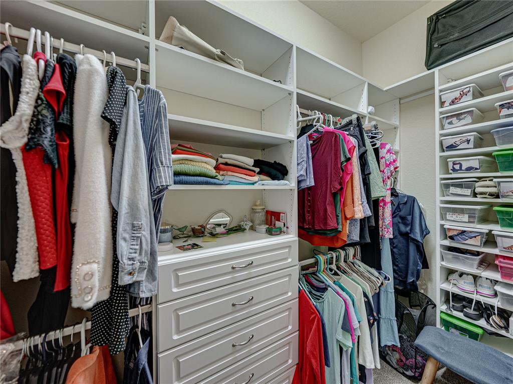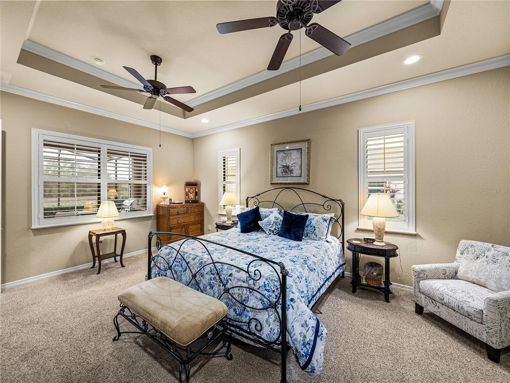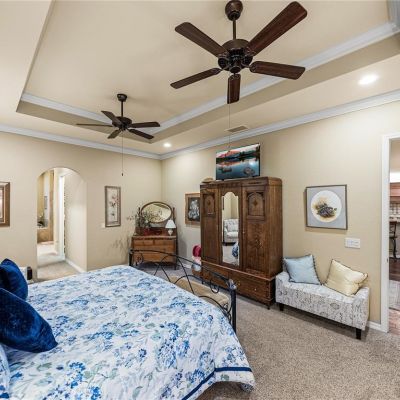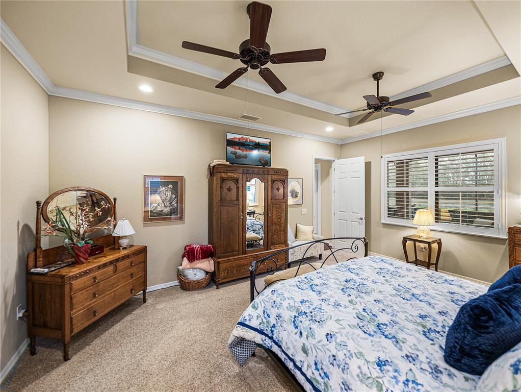 Built-in Features, Ceiling Fan(s), Coffered Ceiling(s), Crown Molding, High Ceilings, Living Room/Dining Room Combo, Open Floorplan, Solid Wood Cabinets, Stone Counters, Thermostat, Walk-In Closet(s), Window Treatments