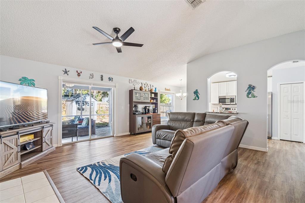 Cathedral Ceiling(s), Ceiling Fan(s), Eating Space In Kitchen, High Ceilings, Living Room/Dining Room Combo, Open Floorplan, Primary Bedroom Main Floor, Stone Counters