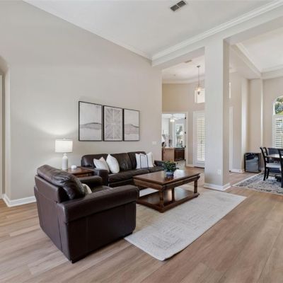 Cathedral Ceiling(s), Ceiling Fan(s), Crown Molding, Eating Space In Kitchen, High Ceilings, Kitchen/Family Room Combo, Living Room/Dining Room Combo, Open Floorplan, Primary Bedroom Main Floor, Solid Surface Counters, Split Bedroom, Stone Counters, Thermostat, Walk-In Closet(s)