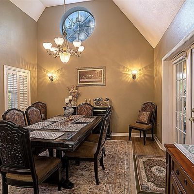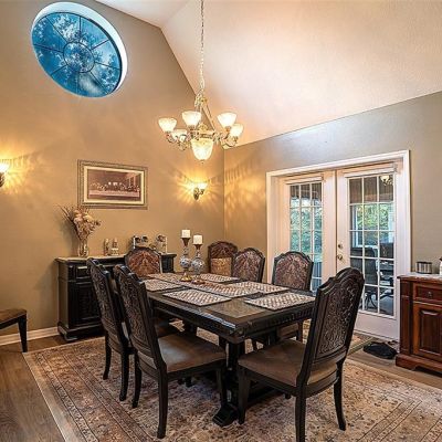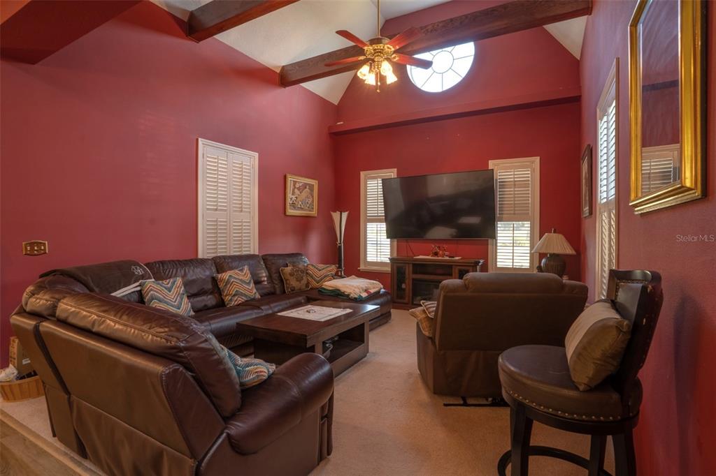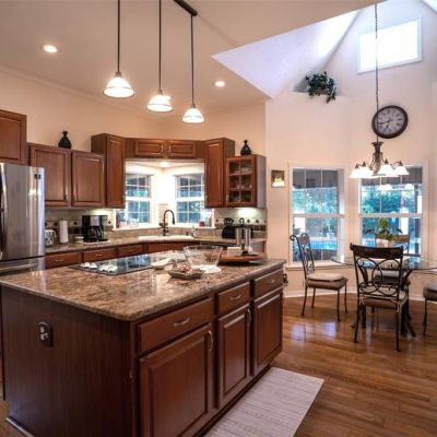 Cathedral Ceiling(s), Ceiling Fan(s), Eating Space In Kitchen, High Ceilings, Kitchen/Family Room Combo, Living Room/Dining Room Combo, Open Floorplan, Primary Bedroom Main Floor, Skylight(s), Solid Wood Cabinets, Split Bedroom, Stone Counters, Walk-In Closet(s), Window Treatments