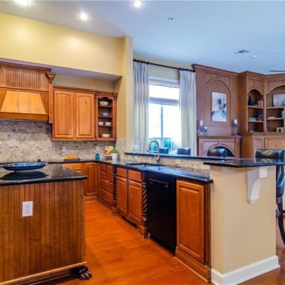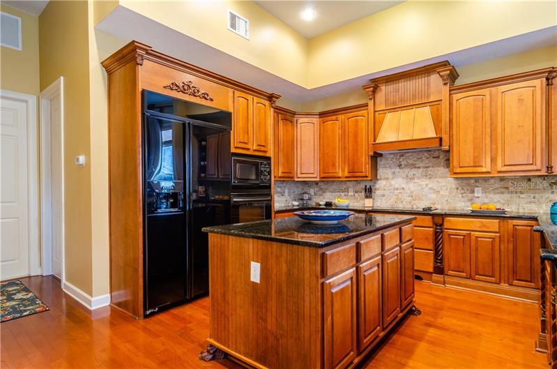 Step into the fully equipped, gourmet kitchen featuring Mahogany cabinetry etched with crown molding, gleaming black granite countertops, refreshment bar and walk-in pantry.