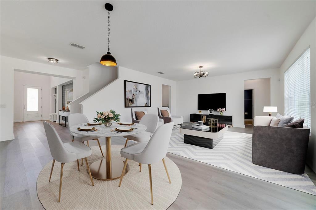 Ceiling Fan(s), Dry Bar, Eating Space In Kitchen, High Ceilings, Kitchen/Family Room Combo, Living Room/Dining Room Combo, Open Floorplan, PrimaryBedroom Upstairs, Solid Wood Cabinets, Split Bedroom, Stone Counters, Thermostat, Walk-In Closet(s), Window Treatments