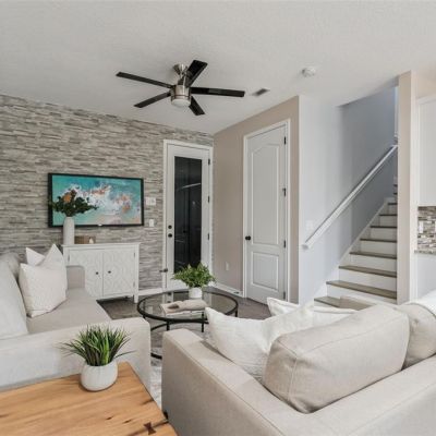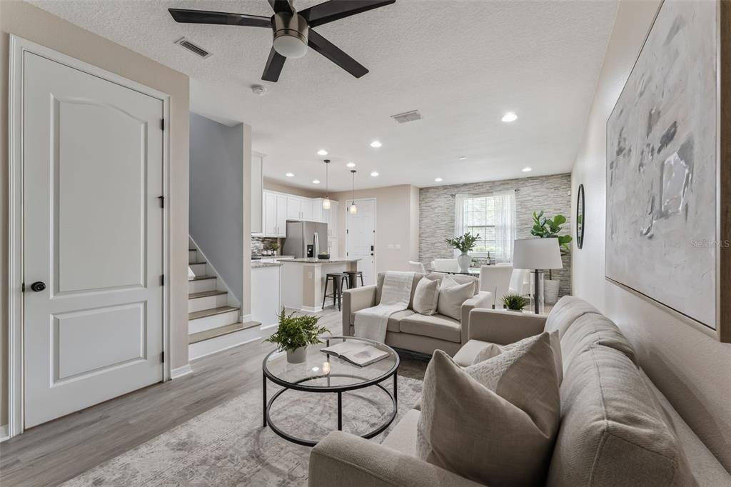 Ceiling Fan(s), Eating Space In Kitchen, High Ceilings, Kitchen/Family Room Combo, Living Room/Dining Room Combo, Open Floorplan, PrimaryBedroom Upstairs, Solid Wood Cabinets, Split Bedroom, Stone Counters, Thermostat, Walk-In Closet(s)