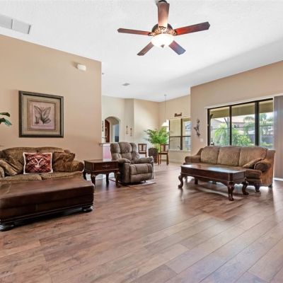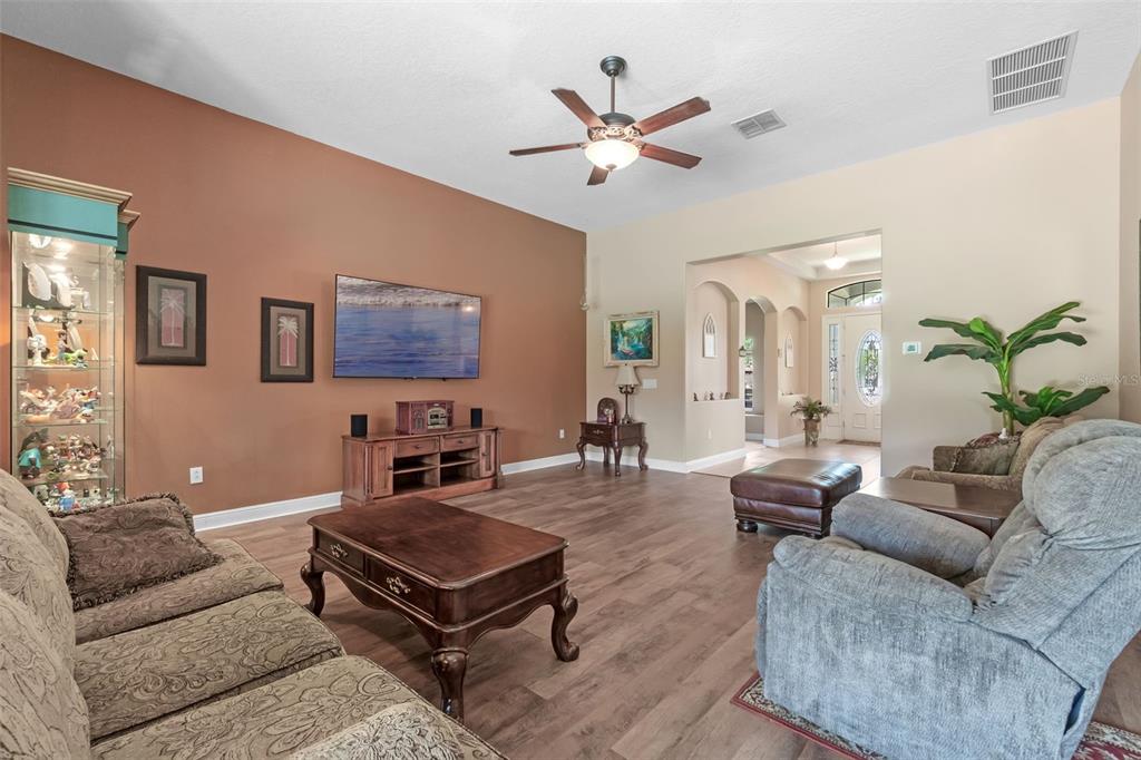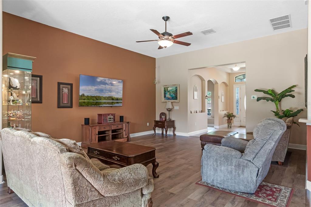 Ceiling Fan(s), High Ceilings, Kitchen/Family Room Combo, Open Floorplan, Primary Bedroom Main Floor, Solid Surface Counters, Solid Wood Cabinets, Split Bedroom, Thermostat, Walk-In Closet(s)