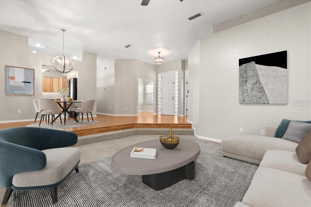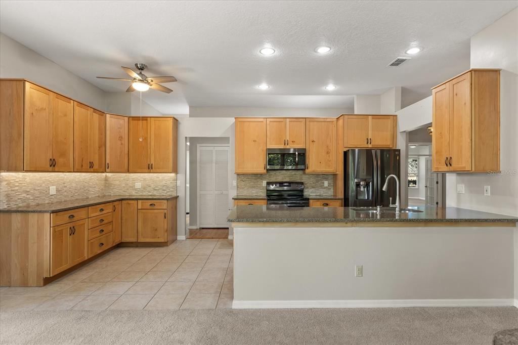 Ceiling Fan(s), Eating Space In Kitchen, Kitchen/Family Room Combo, Living Room/Dining Room Combo, Solid Surface Counters, Split Bedroom, Stone Counters, Walk-In Closet(s), Window Treatments