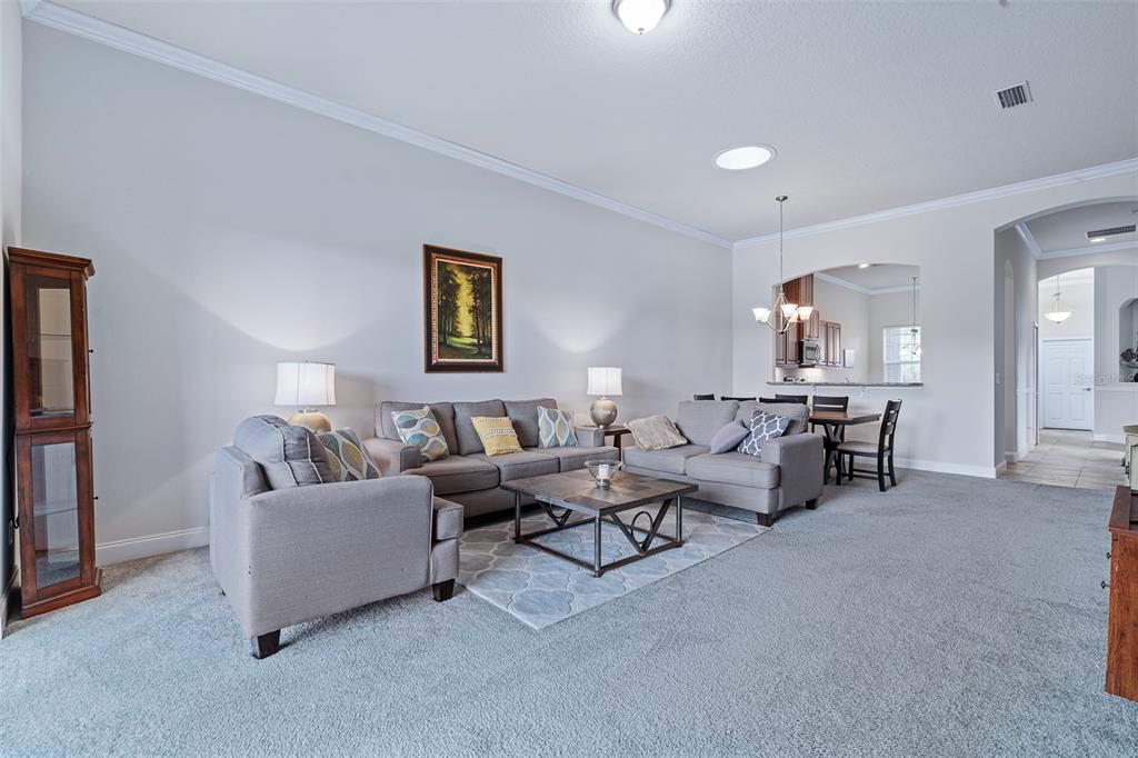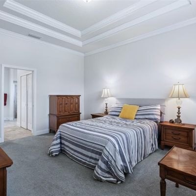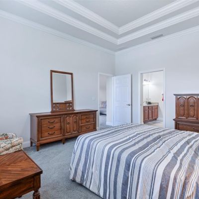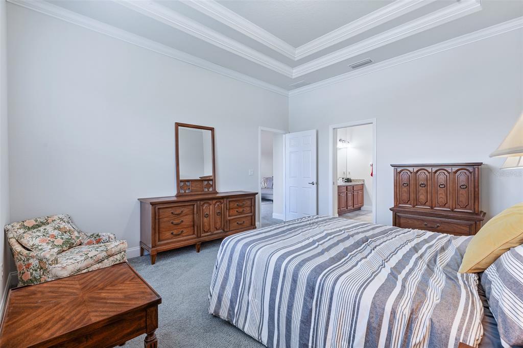 Ceiling Fan(s), Crown Molding, Eating Space In Kitchen, High Ceilings, Living Room/Dining Room Combo, Open Floorplan, Primary Bedroom Main Floor, Solid Surface Counters, Solid Wood Cabinets, Split Bedroom, Stone Counters, Tray Ceiling(s), Walk-In Closet(s)