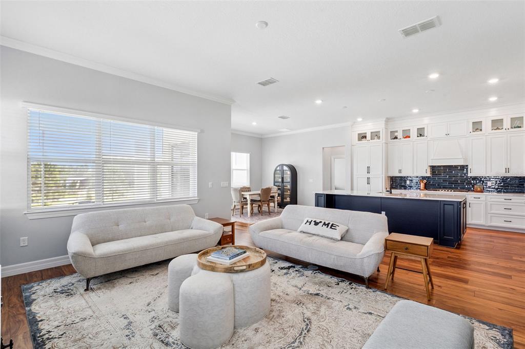 Coffered Ceiling(s), Crown Molding, Eating Space In Kitchen, High Ceilings, Open Floorplan, Stone Counters