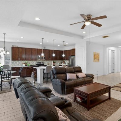 Ceiling Fan(s), Eating Space In Kitchen, High Ceilings, Kitchen/Family Room Combo, Living Room/Dining Room Combo, Open Floorplan, Primary Bedroom Main Floor, Tray Ceiling(s), Walk-In Closet(s), Window Treatments