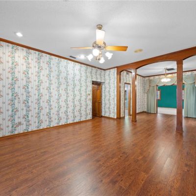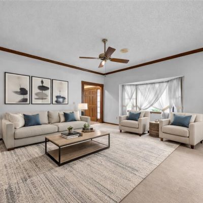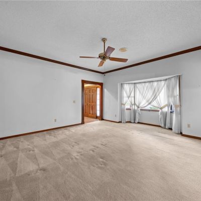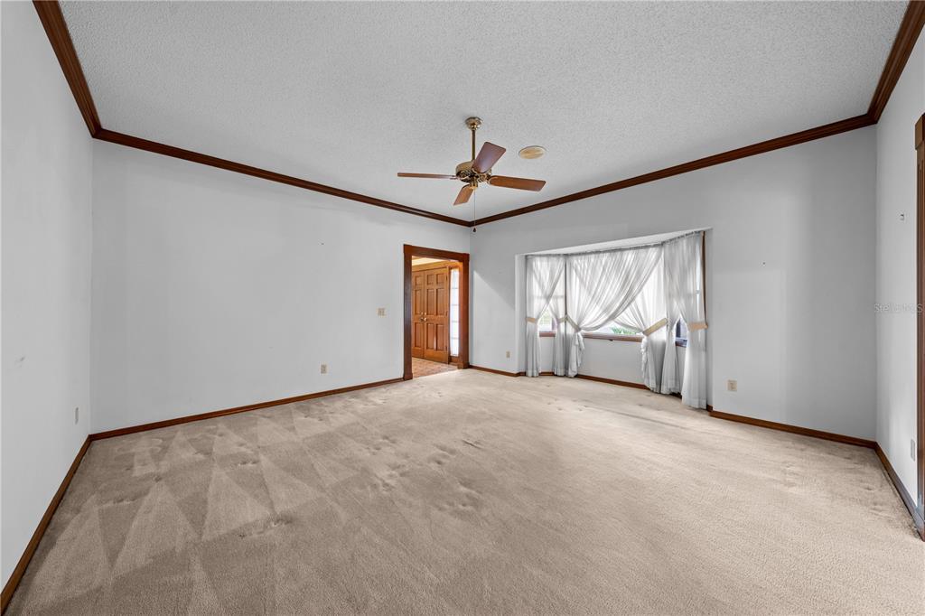 Ceiling Fan(s), Crown Molding, Eating Space In Kitchen, High Ceilings, Primary Bedroom Main Floor, Solid Wood Cabinets, Thermostat, Window Treatments